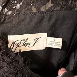 This sophisticated black sheath dress by Eliza J is perfect for cocktail events or as a wedding guest. Featuring a scoop neckline and half sleeves, it offers a refined and elegant silhouette. The intricate lace fabric adds a touch of romance and elegance to the overall design. Back zipper closure with keyhole button closure at the neck. Lined. See photos for measurements.