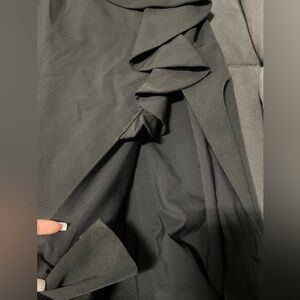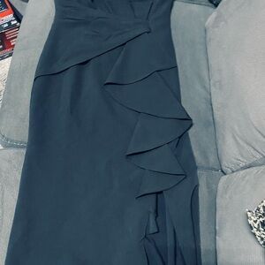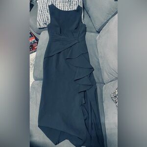 This elegant black maxi dress by Eliza J features a sleeveless design with a sophisticated bateau neckline and a stylish peplum detail at the waist. The floor-length silhouette is accentuated by a dramatic side slit, making it perfect for cocktail events or as a wedding guest. Crafted from a structured fabric, this gown offers a timeless and refined look.