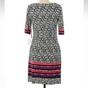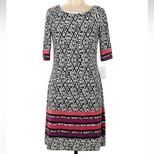 This sophisticated shift dress by Eliza J features a striking black and white geometric pattern, perfect for a work setting. The 3/4 cuffed sleeves and crew neck add a touch of elegance to its sheath silhouette, while the pink accents at the hem provide a subtle pop of color.
