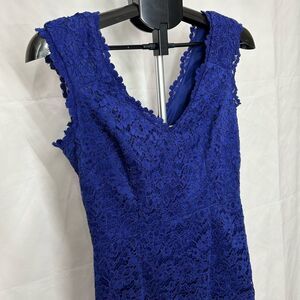 Eliza J Blue Lace V Neck and Back Cocktail Knee Length Sheath Dress Sz 4 super cute for holidays parties office wear work events weddings and more some minor fuzzys on the lace hidden zip back great condition royal blue color Always open to offers bundle and save more! Always fast shipping!
