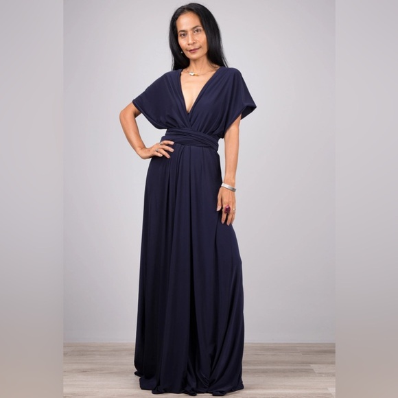This stunning gown by Eliza J features a deep blue hue, a plunging neckline, and elegant dolman sleeves. Perfect for a wedding guest or cocktail event, its wrap design and flowing maxi length offer a sophisticated silhouette.