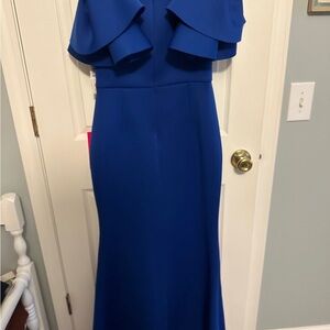 This stunning blue sheath dress by Eliza J is perfect for wedding guests and cocktail events. It features elegant flutter sleeves and a classic crew neck, offering a sophisticated and timeless look.