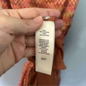 Tiered maxi dress in a multicolor, knit material. Chevron stripe motif. Square neckline with ruffle detail. Belted and fully lined. Belt loop is missing on one side, but does not affect belt function, no flaws otherwise!