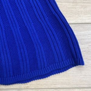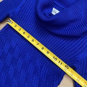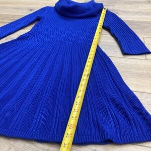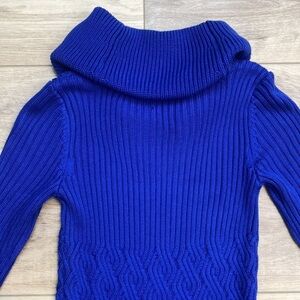 Soft and cozy cowl neck fit and flare sweater dress by Eliza J. The bright royal blue ribbed knit is woven in a contrasting cable knit at the waist for a flattering silhouette. 3/4 sleeves for practical wear and are perfect to pair with a jacket for winter. A comfortable party dress for fall and winter. In excellent condition, like new, Size Petite Small PS