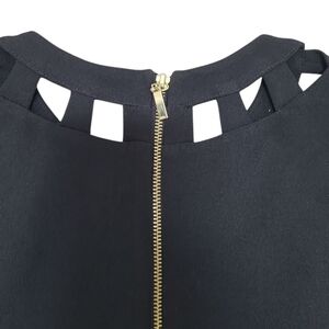Classic black flare sheath dress featuring modern cutout details at the neckline and subtle side pleats at the waist for a flattering, ladylike fit. Slim-fit, petite-friendly size 2 with lined stretch fabric ensures a polished silhouette. Perfect for office, business casual, dinners, cocktail events, or special occasions. Back zipper closure for easy wear. Dry clean recommended.