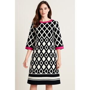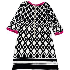 Bold and modern shift dress by Eliza J featuring a black and white diamond pattern with striking fuchsia trim at the neckline and cuffs. Gold exposed back zipper adds a sleek accent. Fully lined, 3/4 bell sleeves, and a straight silhouette. Great for work, luncheons, or events.
