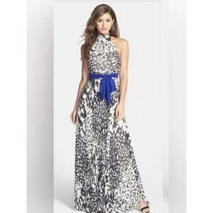 Eliza J Dress Chiffon Halter Maxi Dress Leopard Print Blue Sash Women’s Sz 10P