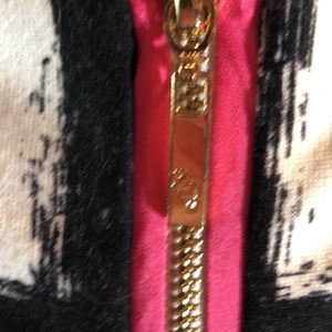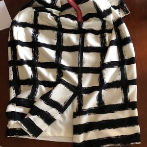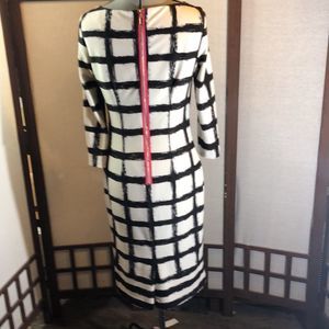 Eliza J Dress sz 6 white polyester knit sheath, 3/4 sleeve, black grid, lined