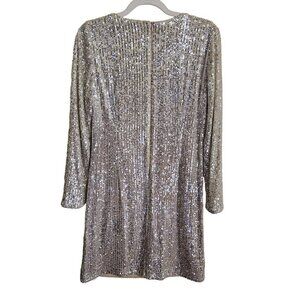 Eliza J Elegant Beige Silver Sequined Sheath Dress Size 8. Pit to pit 20", shoulder to hem 36", Fully Lined, Long Sleeve, Scoop Neck, Hidden Zip Closure, Stunning Elegant Designer Piece, Party, Formal, Wedding, Retail $249. Good Pre-Owned Condition