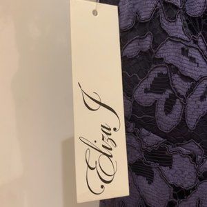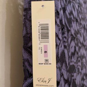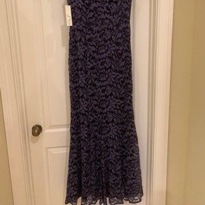 Sweetheart-neck gown with satiny lining and embroider lace overlay, finished by cap sleeves and a flattering V-neck.