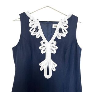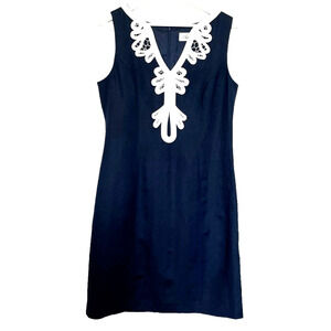 Eliza J Embroidered Neck Sheath Sleeveless Dress Navy/White A breezy linen blend puts a warm-weather spin on this classically femme sheath dress with lacy embroidery tracing the split neckline. Back zip closure. Split neck. Fully lined. 55% linen, 45% rayon.