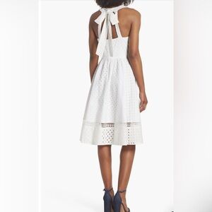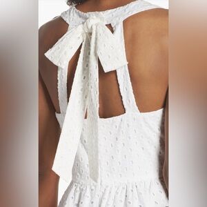 Description: This is a genuine Eliza J eyelet bow back dress. No rips, tears, marks, stains, flaws or defects. NO damages. The dress features all over eyelet embroidered detail, fit and flare silhouette, V-neckline, sleeveless, back zip closure, bow back detail with snap button closure at neckline, front side pockets, fully lined, soft cotton fabric, imported. Retail $158
