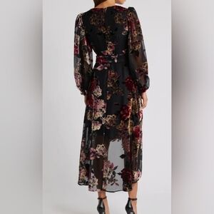 A floral-burnout design brings intrigue and texture to this high-low cocktail dress framed by voluminous long sleeves.
