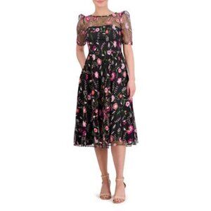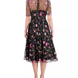 Eliza J dress, floral embroidered dress, black magenta midi dress, illusion neckline gown, fit and flare party dress, mesh overlay dress, wedding guest outfit, Eliza J special occasion dress, floral cocktail dress, feminine embroidered dress, garden party attire, elegant semi-formal dress, NWT designer dress.