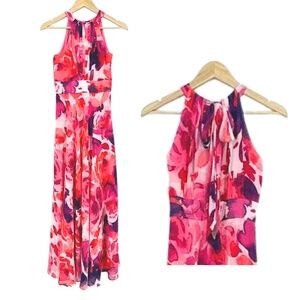 Vibrant floral halter dress with a flowing skirt. Perfect for summer events.