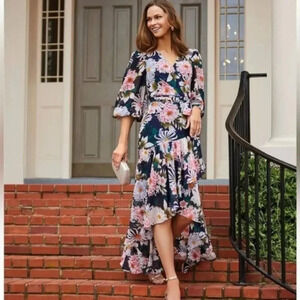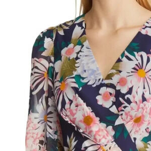 Eliza J Floral Long Sleeve High Low Faux Wrap Midi Dress Navy Size 6 NWT
