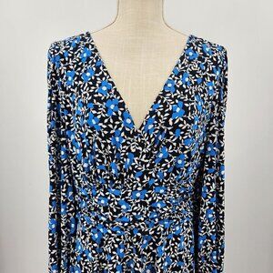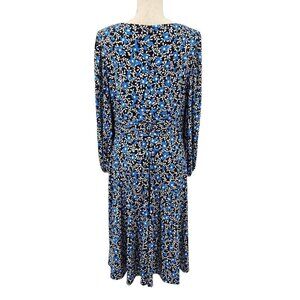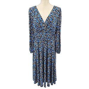 Eliza J Floral Print Crossover Front Fit & Flare Dress Black & Blue V-Neck Balloon Sleeves Knee Length Long Sleeve Lightweight Breathable Stretch Women's