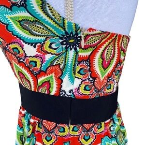 Eliza J Floral Striped Maxi Dress-Women’s Size 4. Bright Red, Blue, White, Black & Green Floral pattern with multi-color striped background. Adorned with a gold chain necklace neckline. Elastic back, hidden zipper at side seam, lightly lined cups, full liner. This is a really beautiful dress!! Definitely a statement piece. Great preowned condition!