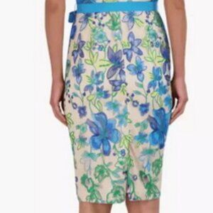A gorgeous garden animates a charming cocktail dress tied with a sash and cut in a fitted, knee-length silhouette.
