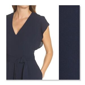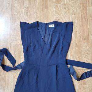 AN96 (tags: navy blue, dark blue, cocktail, evening, date night, wedding, night out, event, professional, modest, classic, classy, flattering, timeless, waist tie, belted, ruffle sleeve, sleeveless, short sleeve)