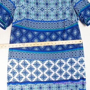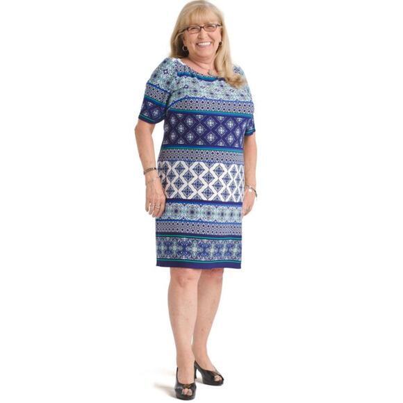 Rows of geometric patterns stripe this flattering blocked shift dress from Eliza J, a standout for day or evening in shades of bold blue and white.