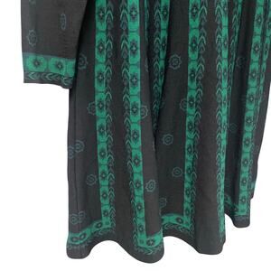 • Features: Pullover styling, Unlined, Fit and flare style with subtle pleating at bottom, Black and green abstract print, Rayon and nylon blend knit fabric, Long sleeve, Sweater dress