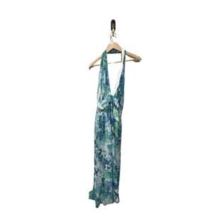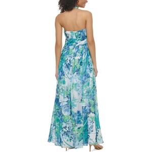 Floral-printed chiffon and a stunning halter neckline with a bodice cutout define this slitted A-line gown from Eliza J.