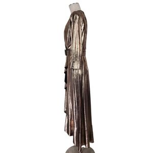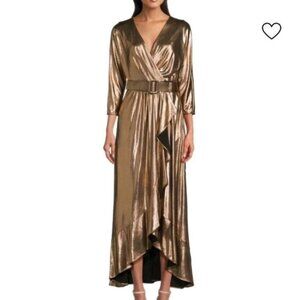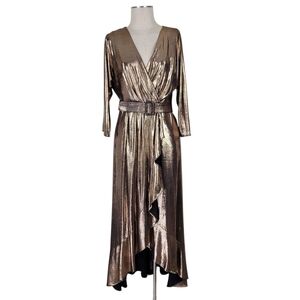 Eliza J High Low Dress Size 10 Metallic Ruffled Belted Surplice 3/4 Sleeve Lined