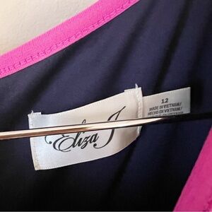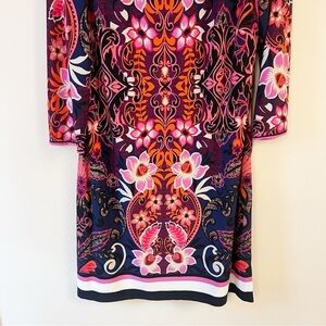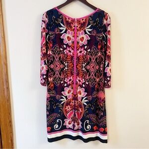 Excellent condition. Shift dress. Back zipper. Hot pink, navy blue, maroon floral print. Knee length. Round neck. 3/4 sleeves. Mosaic print.