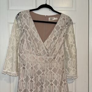 Eliza J Ivory Embroidered Lace Illusion Pom Pom Fit Flare Dress Size 6