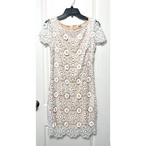 Elegant sheath dress featuring a delicate floral lace overlay, short sleeves, and a scalloped hemline. Fully lined for comfort and style.