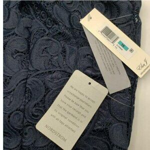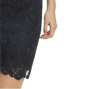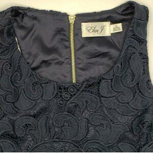 Bold lace flourishes float on the sheer mesh background of a chic, streamlined sheath cut with a shoulder-baring racerback. Exposed back-zip closure. Jewel neck. Sleeveless. Lined.