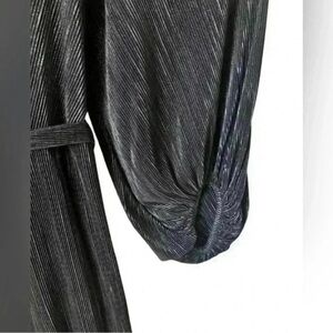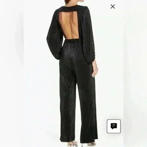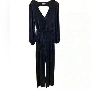 A gorgeous jumpsuit from Eliza J - full of shimmer and striking details for your next event. Shimmery black fine pleated fabric. Gorgeous open back. Long balloon sleeves, surplice neckline, removable sash belt. Wide leg.