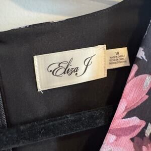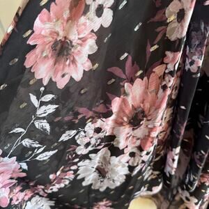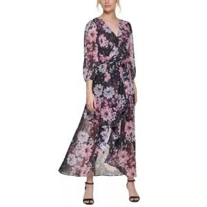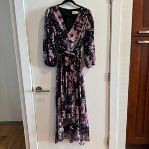 Eliza J Metallic Floral Maxi Dress Black Purple Waist Tie Long Sleeve Sz 10