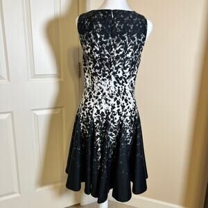 Elegant sleeveless dress with abstract black and white design. Ideal for any occasion.