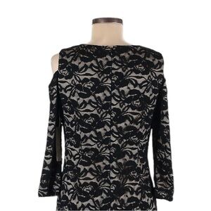 New with tags Eliza J black lace bodycon midi dress in size 6. Features a nude lining with elegant black floral lace overlay, cold shoulder cutouts, and long sleeves. Ideal for cocktail parties, weddings, or evening events.