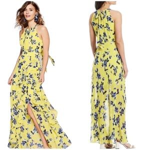 Eliza J NWT Halter Ruffle Maxi Dress 12 Sleeveless Chiffon Gown Yellow Blue