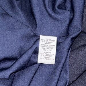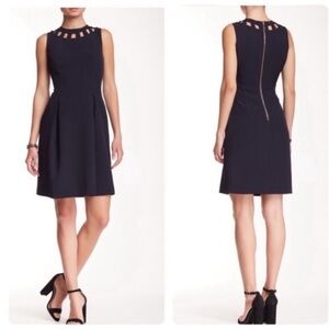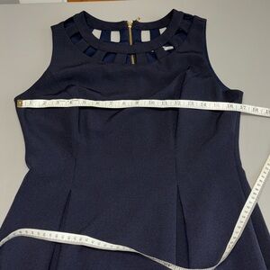 Navy blue classic dress. Round neck with cutout cage-like detailing. Sleeveless. Lined. Zip closure.