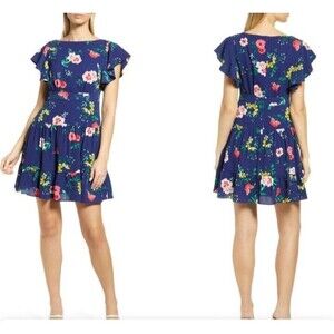 Eliza J Navy Blue Floral Mini Dress Women 14 Flutter Sleeve Fairy Cottagecore