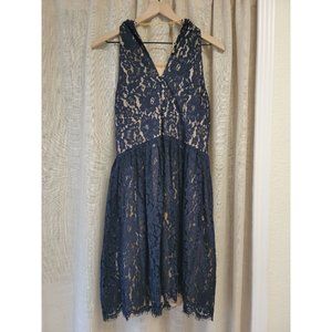 Adorable Navy blue lace halter dress with gold chain neckline. Sleeveless with a hidden zipper closure. fit and Flare. Fully lined.