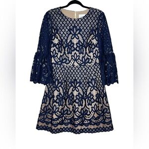 Eliza J Navy Blue Lace Over Nude Dress with Bell Sleeves, Size Medium (10)