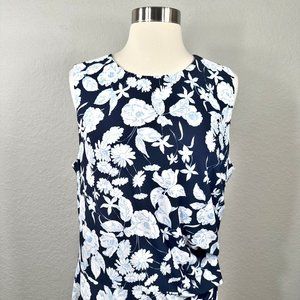 Eliza J Navy & Coral Floral Sleeveless Ruched Waist Stretchy Midi Dress. Ruffle hem. Zipper back closure. *AI model depiction of style.