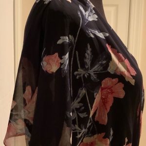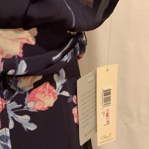 Perfect wedding guest or special occasion dress! Eliza J flattering faux wrap dress, in a beautiful navy floral print, with flutter sleeves, tie belt, back zip, size 10. Slip lining. Fabric is polyester with chiffon feel — feels fantastic on, great movement and flow. Great dancing dress! New with tags, never worn.