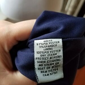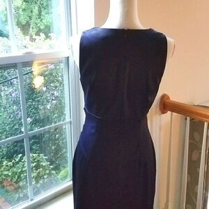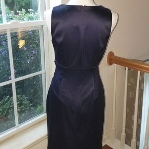 Eliza J Navy Satin Beaded Neckline Dress Size 6. Missing a few beads up top, replacable. Hidden back zipper.
