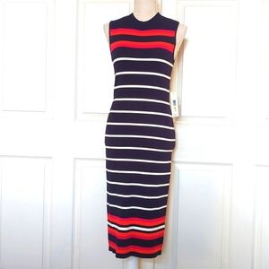 Eliza J Navy Striped Sheath Body Contour Dress. Stipes featured in white, pink and orange. Slips on over head. Ribbed neck. Sleeveless. Unlined. Rayon and nylon blend.
