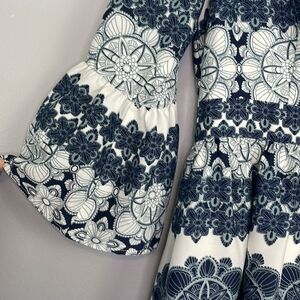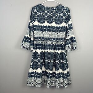 Stylish mini dress by Eliza J. Features navy floral patterns on a white background. V-neckline and three-quarter sleeves. Perfect for any occasion.