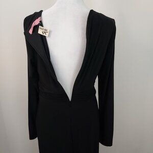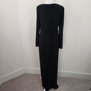Size 6 Eliza J New York Black Embellished Formal Dress. 95% polyester 5% spandex. Lining 100% polyester. Surplice neckline. Long sleeves. Ruching at waist. Wrap skirt that opens in front. Hidden zipper closure at back. Pit to pit 16". This formal gown was worn during the Underground Runway Show. Excellent condition with no visible flaws.