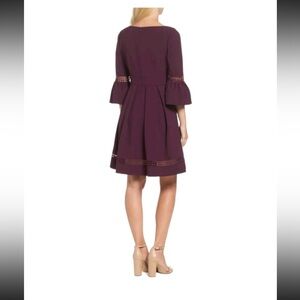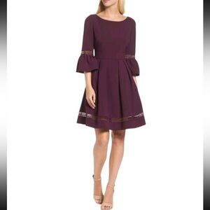 Eliza J plum dress, fit & flare cocktail dress, bell sleeve formal dress, wedding guest dress, plum purple dress, lace trim party dress, size 6 evening dress, holiday dress women