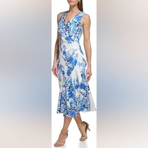 Elegant sleeveless dress by Eliza J features blue and white floral printed knit, midi style, and ruffle detail for a flattering and flirty flair. Wear this exquisite dress for a wedding, graduation, or cocktail party.