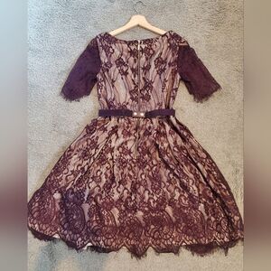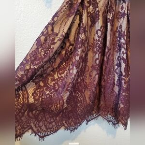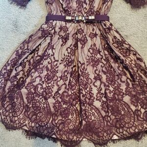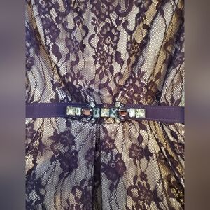 Elegant purple lace midi dress. Features intricate lace overlay. Includes a stylish belt accent.